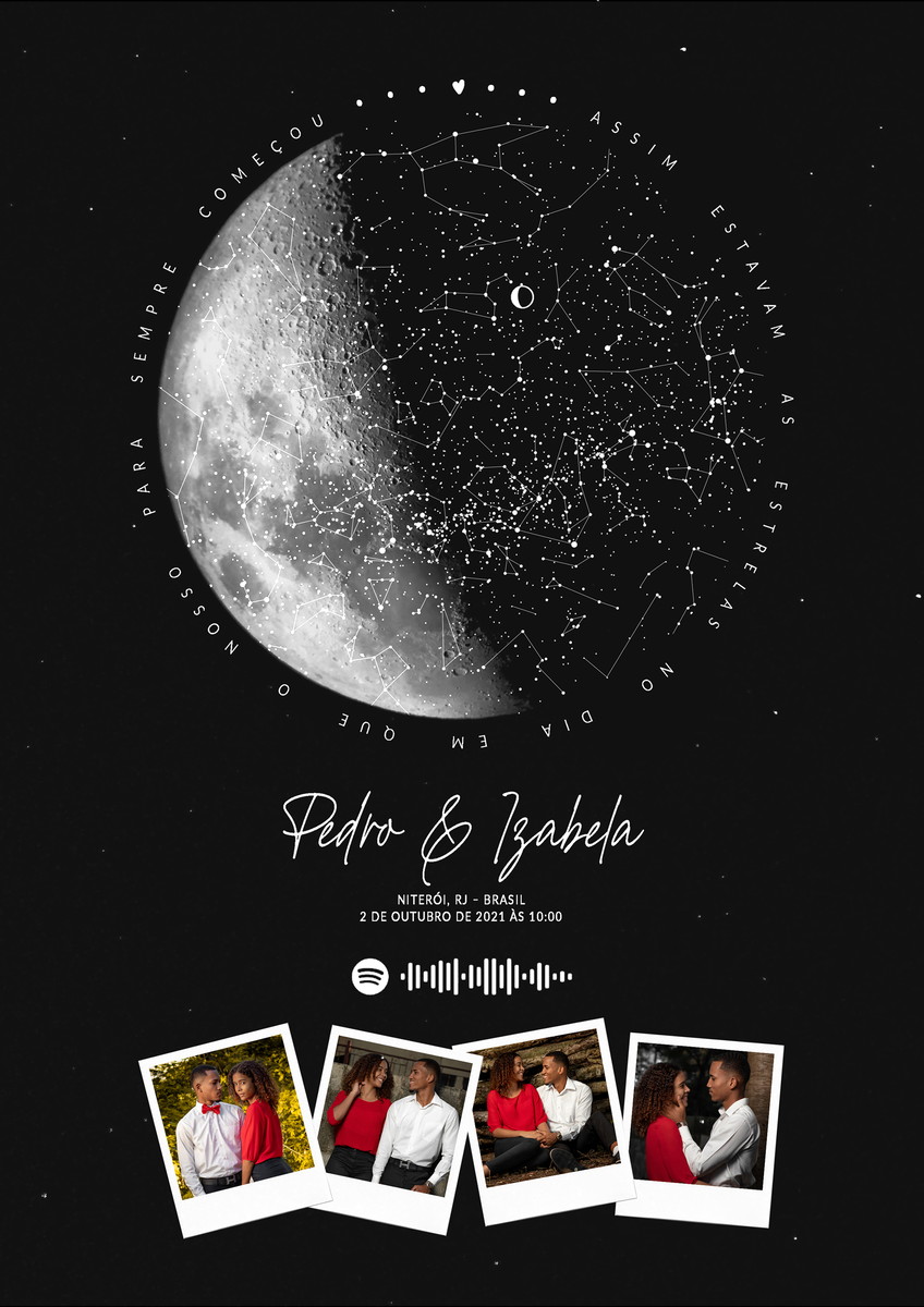 O quadro é feito com as informações de uma data escolhida por você, suas fotos e o QR code do Spotify de sua trilha sonora ou música favorita, sendo ideal para ocasiões que merecem ser celebradas.