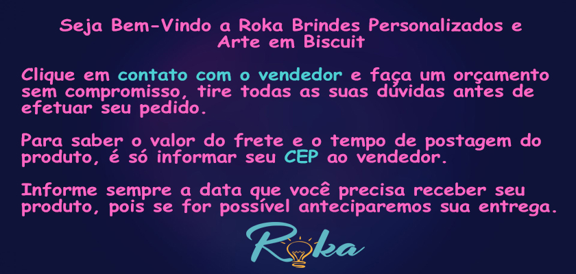 Seja bem -vindo a Roka Brindes Personalizados! Produtos artesanais sob encomenda *Para saber quando o seu pedido vai chegar pra vc, considere o prazo de produção + o prazo de postagem do produto ( contando em dias úteis ) e se precisar receber antes informe a data ao vendedor para ver a possibilidade de antecipar sua entrega *Todo pedido feito e depois cancelado prejudica o vendedor *O prazo de entrega será contado a partir da data de confirmação de seu pagamento *Quando o produto for personalizado, a arte será enviada para a sua aprovação. Vc deve ficar atento as mensagens .No caso de falta de resposta do cliente na aprovação da arte em tempo hábil para a postagem dentro do prazo, o pedido será enviado sem a personalização, para que não ocorra atraso no envio do mesmo. Não cabendo reclamações posteriores. *Ao receber sua encomenda confirme a entrega e deixe sua avaliação pois, ela é importante para novos compradores como você medirem a qualidade do atendimento e de nossos produtos. Obrigado pela visita Equipe Roka