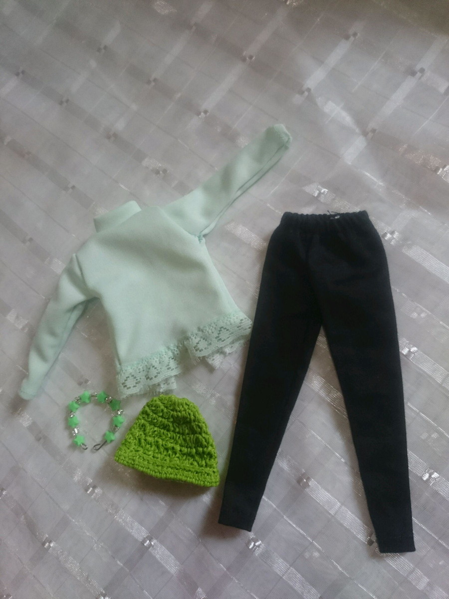 Calça comprida em brim preto com elastano, elástico na cintura . Blusa verde água com mangas longas e gola alta.