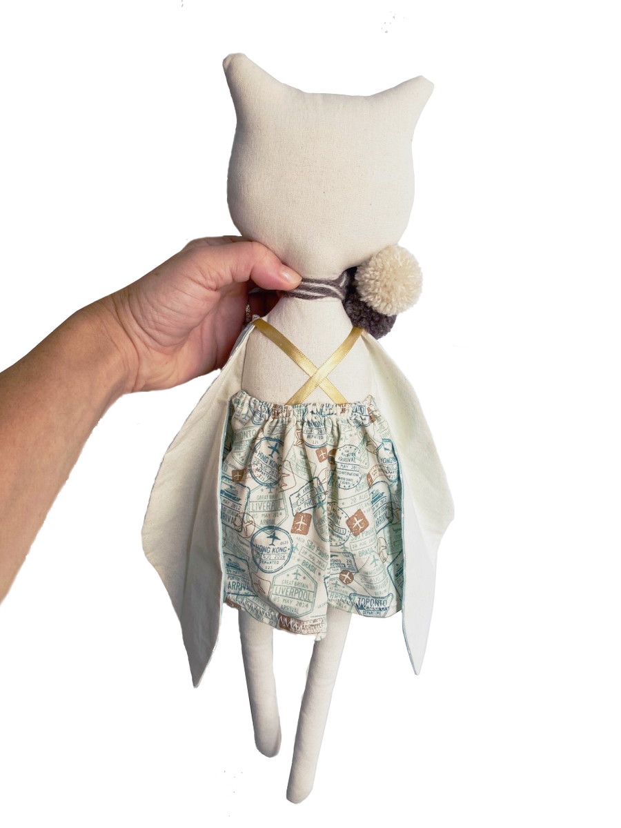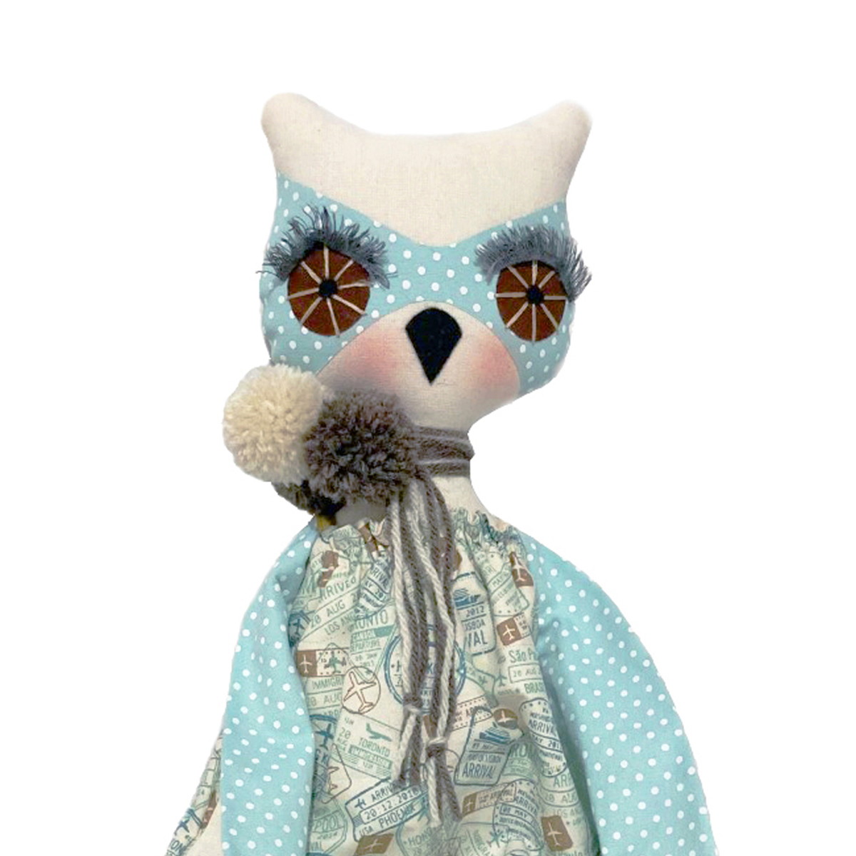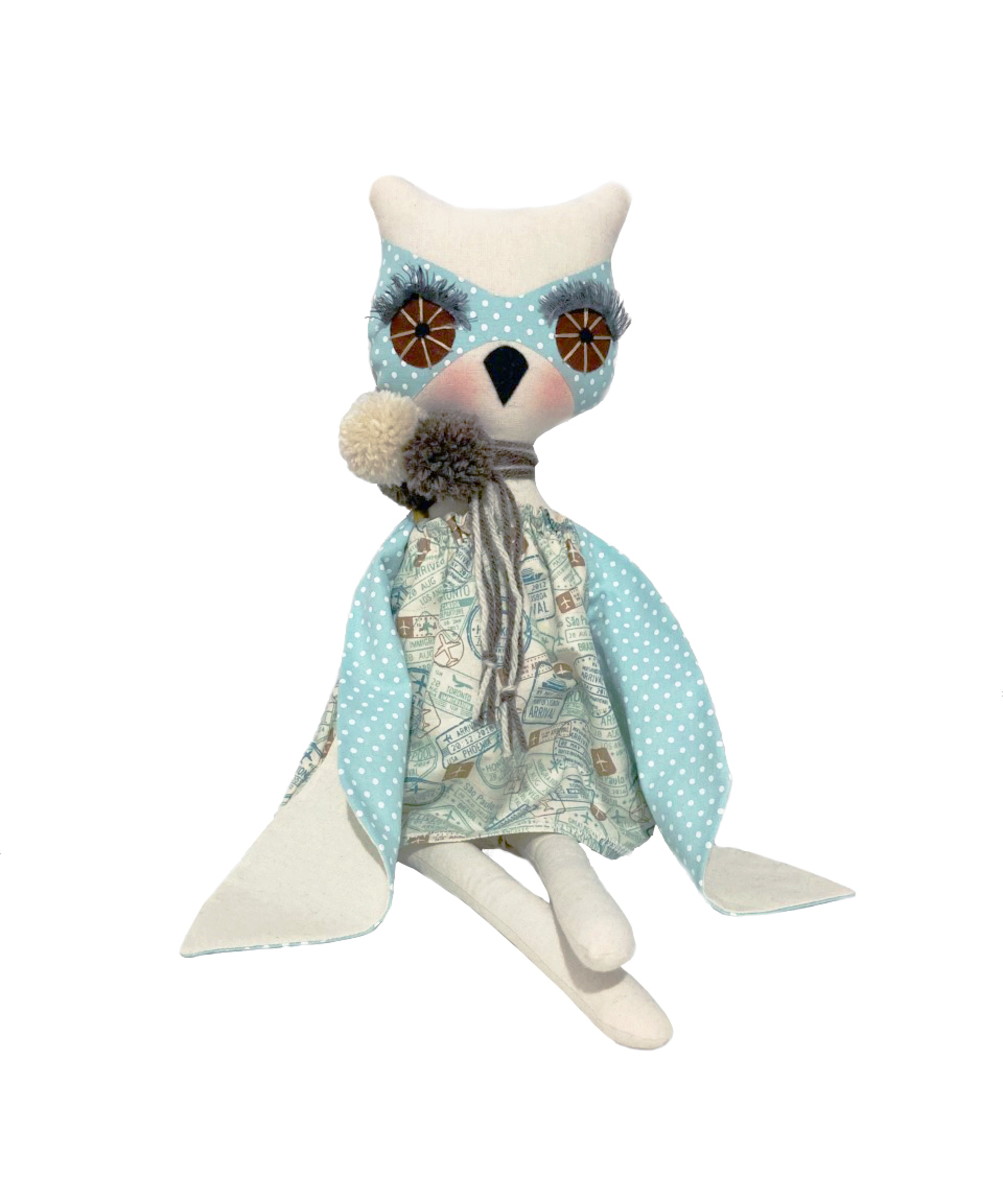 Coruja feita em tecido de algodão, usando as técnicas de costura e bordado