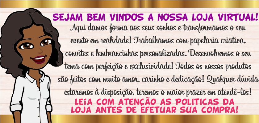 * LEIA ATENTAMENTE AS POLÍTICAS DA LOJA! APÓS EFETUAR O PEDIDO, VOCÊ ESTÁ CONCORDANDO COM OS TERMOS ABAIXO * 1 - Antes de fazer seu pedido utilize o campo "CONTATAR VENDEDOR". Esse é o canal de comunicação entre nós e você para esclarecer dúvidas, consultar prazos e demais informações. Caso tenhamos conversado por outros meios, deixe na descrição do pedido um lembrete de quem você é e o que foi acordado na conversa anterior. 2 - Nosso horário de atendimento é de segunda-feira a sábado, das 08:00h ás 13:00h. Não há expediente aos domingos e feriados. Faremos o possível para respondê-lo de imediato, mas caso isso não aconteça, você será respondido em até 24 horas. 3 - Nossos produtos são confeccionados artesanalmente e são personalizados de acordo com o seu tema. Não trabalhamos com produtos a pronta entrega. O prazo para produção é de até 15 dias úteis para artes digitais e 30 dias úteis para produtos artesanais, contados a partir da confirmação do pagamento. Caso você tenha urgência para receber os pedidos, entre em contato conosco antes de efetuar a compra para verificar a disponibilidade. 4 - Pedidos com pagamentos não confirmados serão cancelados em 5 dias corridos, para que não gerem cobranças extras para a loja. 5 - O pagamento poderá ser feito através de boleto bancário ou depósito bancário (BANCO DO BRASIL, ITAÚ ou CAIXA ECONÔMICA FEDERAL). Trabalhamos também com todos os cartões de crédito, podendo parcelar o pedido em até 12x com juros acrescidos, e com débito online. 6 - Nossos produtos são confeccionados com papéis fotográficos de acabamento fosco. O papel fotográfico necessita de um cuidado especial, pois desbota com o tempo e com a exposição à luz. Portanto, quando receber sua encomenda, mantenha na embalagem original que enviamos até a véspera da festa. 7 - O frete é por conta do cliente, e pode ser enviado por Sedex ou PAC, através dos Correios. Caso o cliente deseje, pode retirar a encomenda pessoalmente na cidade de Niterói/RJ. Após postada a encomenda, ficamos sujeitos a política do mesmo. Você receberá o código de rastreio para acompanhar o andamento do pedido pelo site dos Correios. Não nos responsabilizamos por volta de objetos devido à problemas no endereço. Utilizamos o endereço cadastrado no site, portanto, antes de efetuar a compra, atualize o endereço de entrega no seu cadastro do Elo7. Não nos responsabilizamos por atrasos dos Correios, greve ou qualquer outro problema decorrente da entrega, porém, acompanhamos o rastreamento também, para podermos dar assistência para entrar em contato e verificar o problema. Se algum produto chegar quebrado e/ou amassado, favor entre em contato o mais breve possível após o recebimento, enviando também as fotos e informando quantas peças sofreram danos. Caso você não seja o recebedor da mercadoria, peça a quem recebeu que abra a caixa e confira a integridade das peças. Caso haja tempo hábil para produção e envio de nova encomenda, iremos fazer um item substituto (envio por conta do cliente). 8 - Não fazemos artes sem compromisso. Para confecção das artes, é necessário informar os seguintes itens: TEMA, NOME DO ANFITRIÃO, DATA, PALETA DE CORES, PREFERÊNCIAS DE ESTAMPAS (poá, listras, floral, xadrez, entre outros), e em caso de convites, LOCAL, HORÁRIO E LISTA DE CONVIDADOS (para elaborarmos as tags com os nomes dos convidados). Após recebidas essas informações, a arte é produzida e enviada para aprovação em até 10 dias úteis. Confira o texto com atenção para verificar se há algum erro. Após a aprovação do cliente, não nos responsabilizamos por possíveis erros de ortografia/caligrafia. 9 - Verifique as medidas do produto e o material que são feitos antes de efetuar a compra. Não aceitaremos reclamações referentes a esta questão após o recebimento. 10 - Para garantir a integridade das peças, a maioria das caixinhas é enviada colada e desmontada, para que o cliente finalize a montagem em casa. Enviamos junto instruções de montagem em caso de caixinhas com fundo de encaixe.