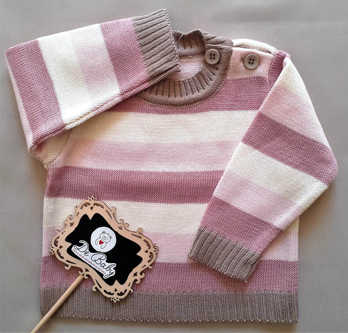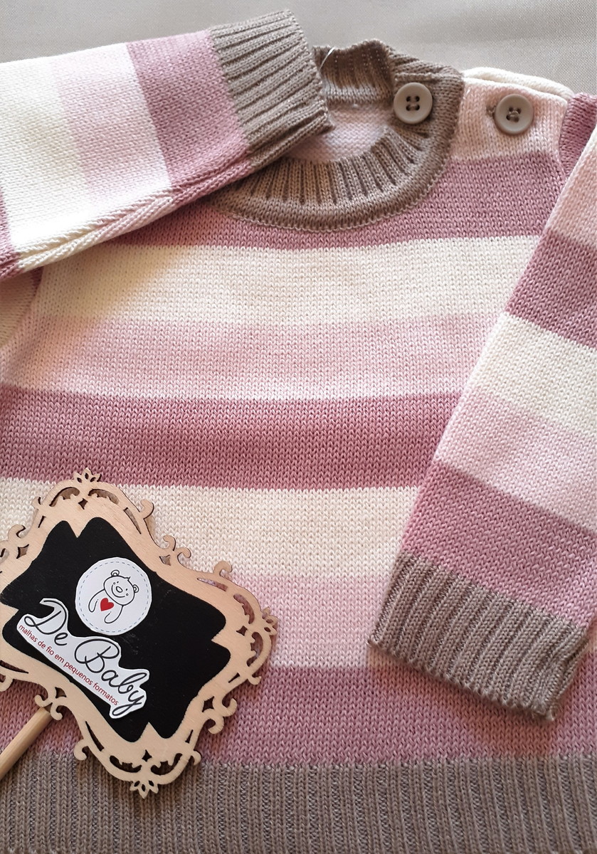 -Suéter listrado nas cores ROSA, SALMÃO e ROSA, ribana MARROM claro com botões no ombro.