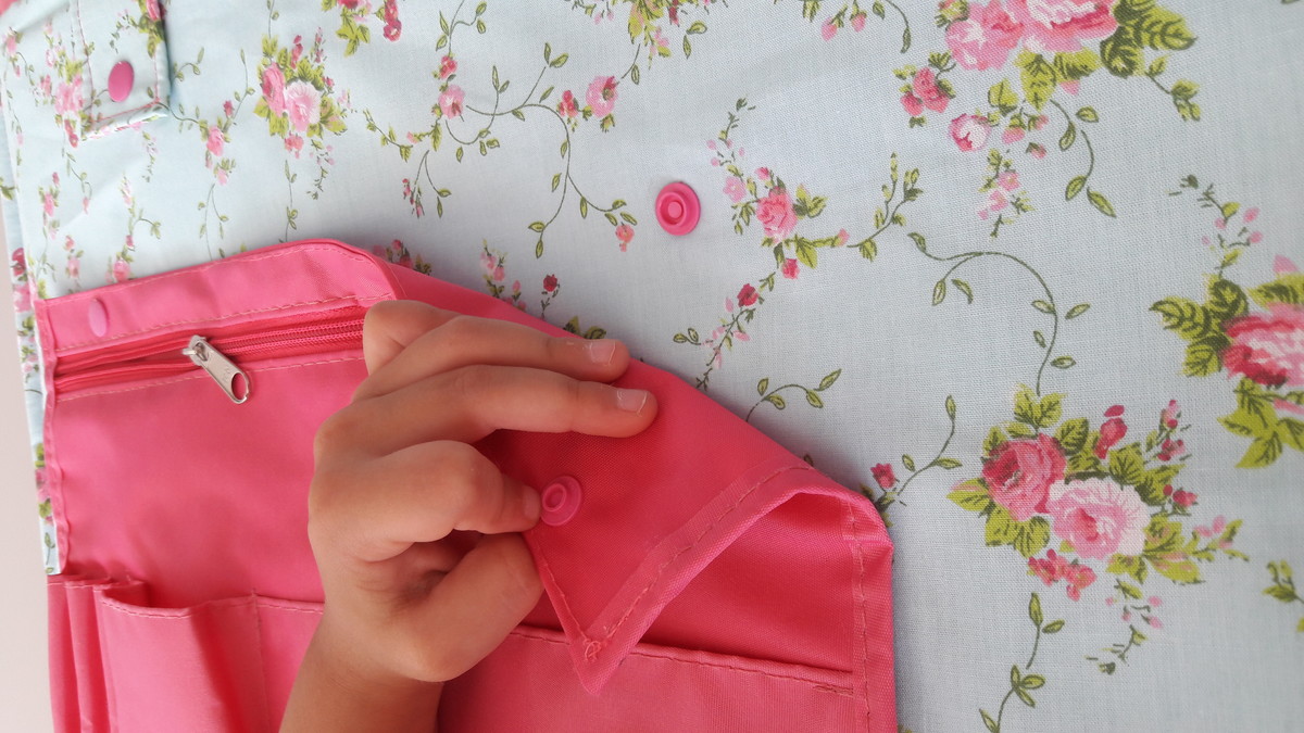 Suporte e bolsa para material de patchwork ou scrapbook, para base de corte, régua, cortadores de corte entre outros acessórios. Com bolso removível, bolso pra réguas, bolso grande pra placa e corte que fecham com botões facilita tirar pela lateral ou por cima. Com alça para transportar e alças para pendurar em varão para ateliê.