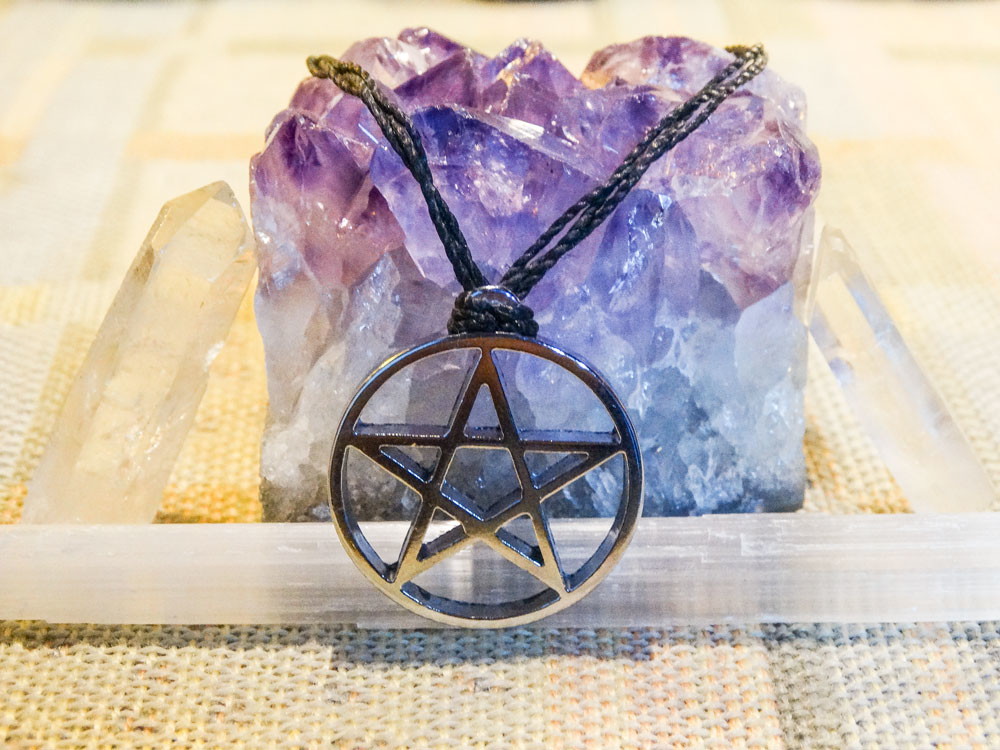 Colar Pentagrama metálico com fio encerado e trançado de tamanho ajustável.