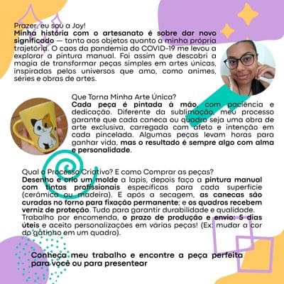 Olá cliente, seguem as políticas da loja, qualquer duvida estamos sempre a disposição. POLÍTICA DE TROCA E DEVOLUÇÃO Aceitamos trocas e devoluções em até 7 dias após o recebimento do produto, mediante contato prévio via mensagem. O produto deve estar na embalagem original, sem indícios de uso e em perfeito estado O custo do frete de retorno fica por conta do cliente Após a análise do produto, o reembolso ou troca será processado PRAZO DE PRODUÇÃO E ENVIO Prazo de produção: 5 dias úteis após a confirmação do pagamento Envio: Realizado imediatamente após a finalização da peça Aviso importante: Por se tratar de produtos artesanais pintados à mão, cada peça é única e pode apresentar variações sutis em relação às fotos, o que faz parte do charme do trabalho manual MEIOS DE PAGAMENTO ACEITOS Cartão de Crédito: Em até 12x (parcela mínima de R$ 30,00) Cartão de Débito PIX (5% de desconto no pagamento via PIX) ATENDIMENTO AO CLIENTE Respondemos todas as mensagens em até 24 horas úteis, mas nos esforçamos para responder o mais rápido possível! Fique à vontade para tirar qualquer dúvida sobre produtos, personalizações ou prazos. PERSONALIZAÇÕES As peças que permitem personalização são claramente indicadas na página do produto. Para essas peças, todas as especificações devem ser combinadas por mensagem antes da finalização do pedido.