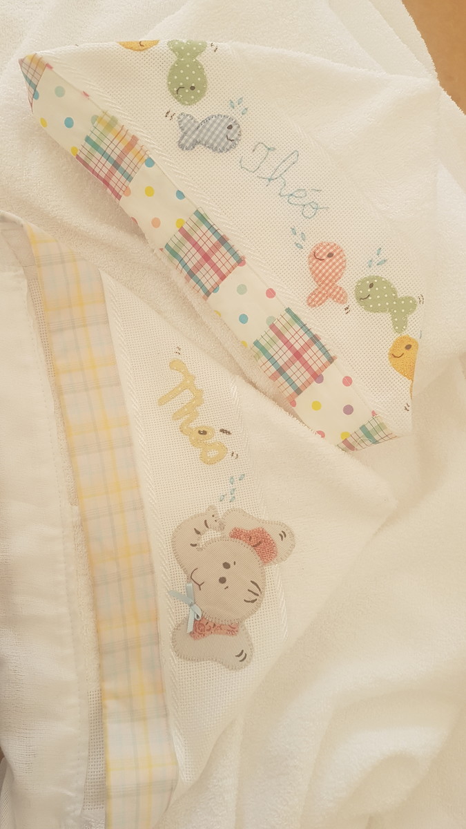 Toalha de Capuz, tecido atoalhado, forrado com fralda, bordado patchwork e acabamento a mão