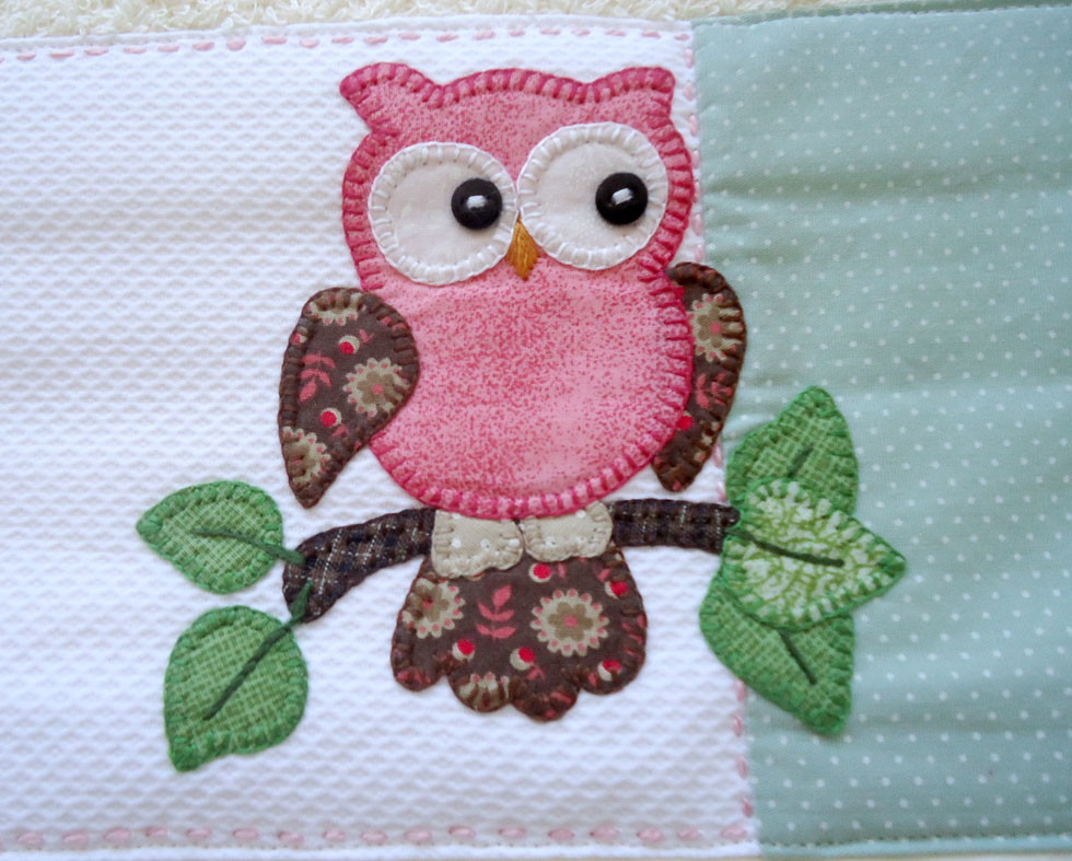 Toalha de lavabo na cor bege com aplicação em patchwork feito à mão com motivo de corujinha e acabamento em bordado inglês.
