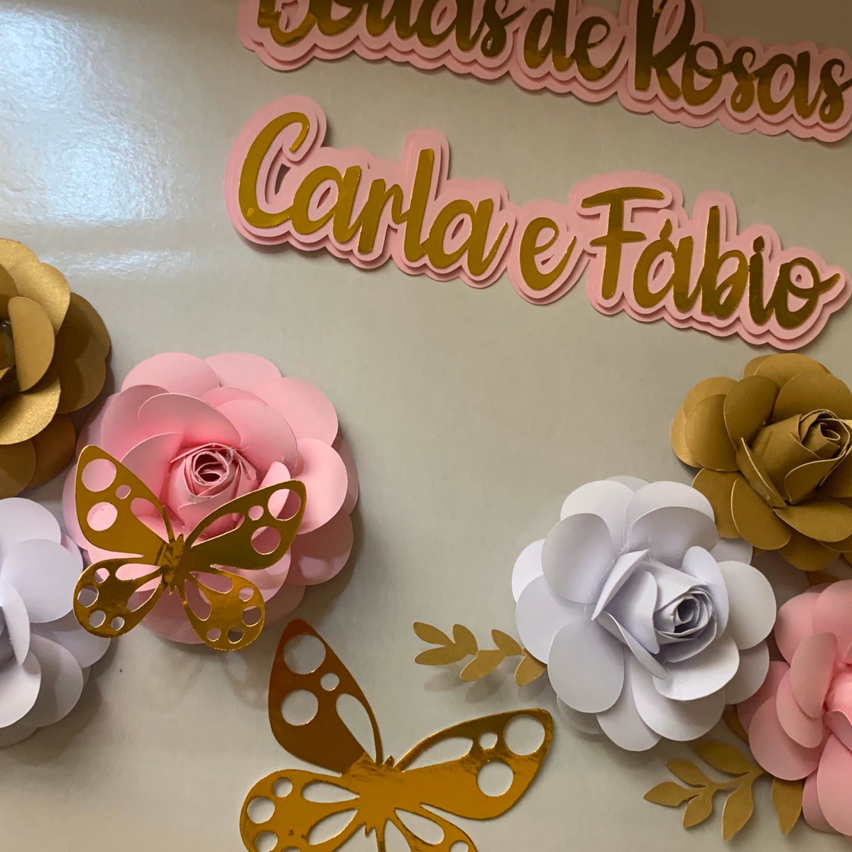 O nome é feito em As flores sao 3 feitas em color plus 180gr e folhas em papel laminado dourado.