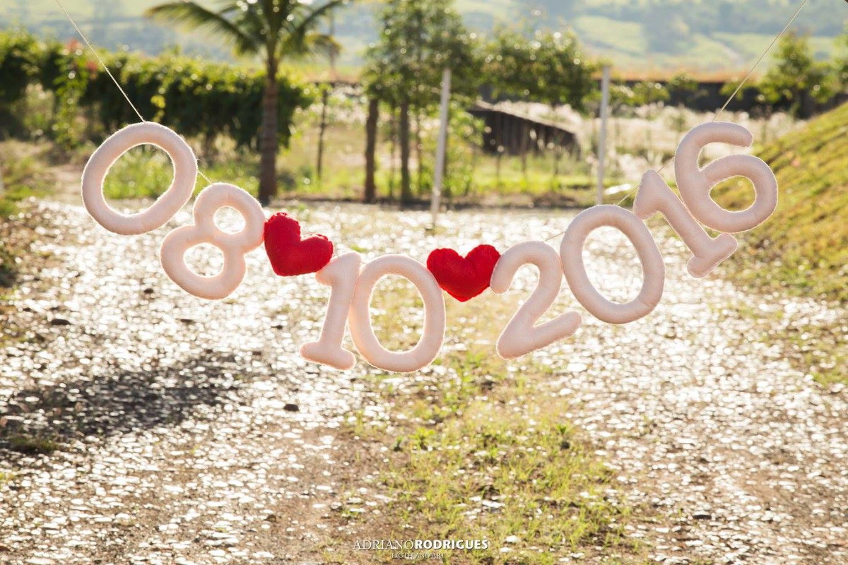 Confeccionado em cordão de cetim, com a data em feltro e no formato 00/00/000. Possui 2 corações em feltro separando os números e o cordão possui pérolas em suas extremidades.