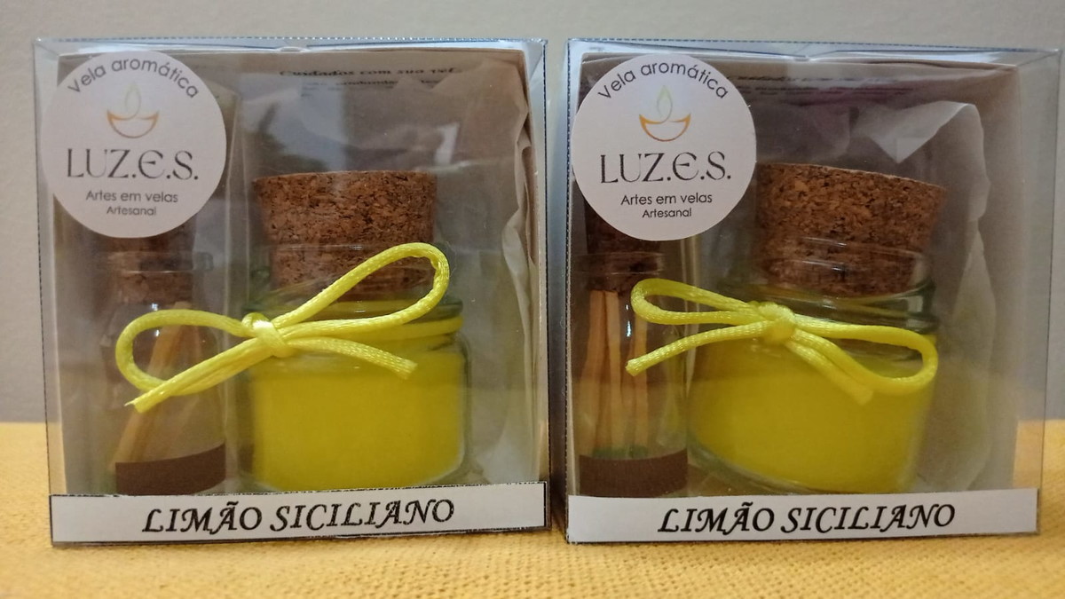 Kit de vela no vidrinho com 40 gramas com aroma de limão siciliano com vidrinho de fosforo numa caixinha