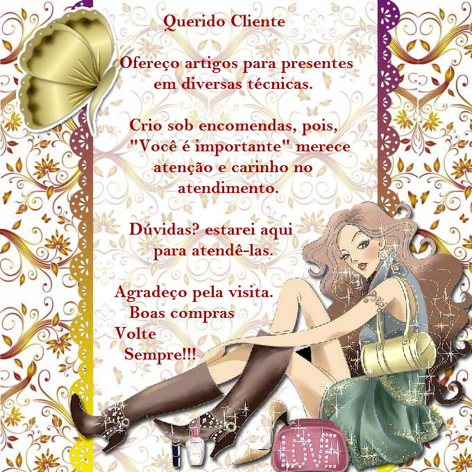Como já disse crio junto com os clientes o desejado, quando não encontrado. Quanto aos prazos de entregas, tudo é conversado antes ou durante a realização do pedido feito. Técnica como Biscuit requer um prazo maior, necessário para secagem das peças, quando não são encontradas para pronta entrega ou pela quantidade solicitada. O crochê em Fio de Malha, muitas vezes não tendo a cor desejada pelo cliente, deve ser encontrada por mim, uma vez que esse fio não tem código ou numeração como muitos dos fios. Para aceitação do pedido, se está de acordo com o solicitado, posso colocar as fotos na loja para que vejam o andamento ou mudanças a realizar. Quanto padronagens, o mesmo se dá. Procurarei sempre que possível atender meu cliente da melhor forma, pois eu os vejo por mim, quando de uma compra desejada, quero sempre o melhor