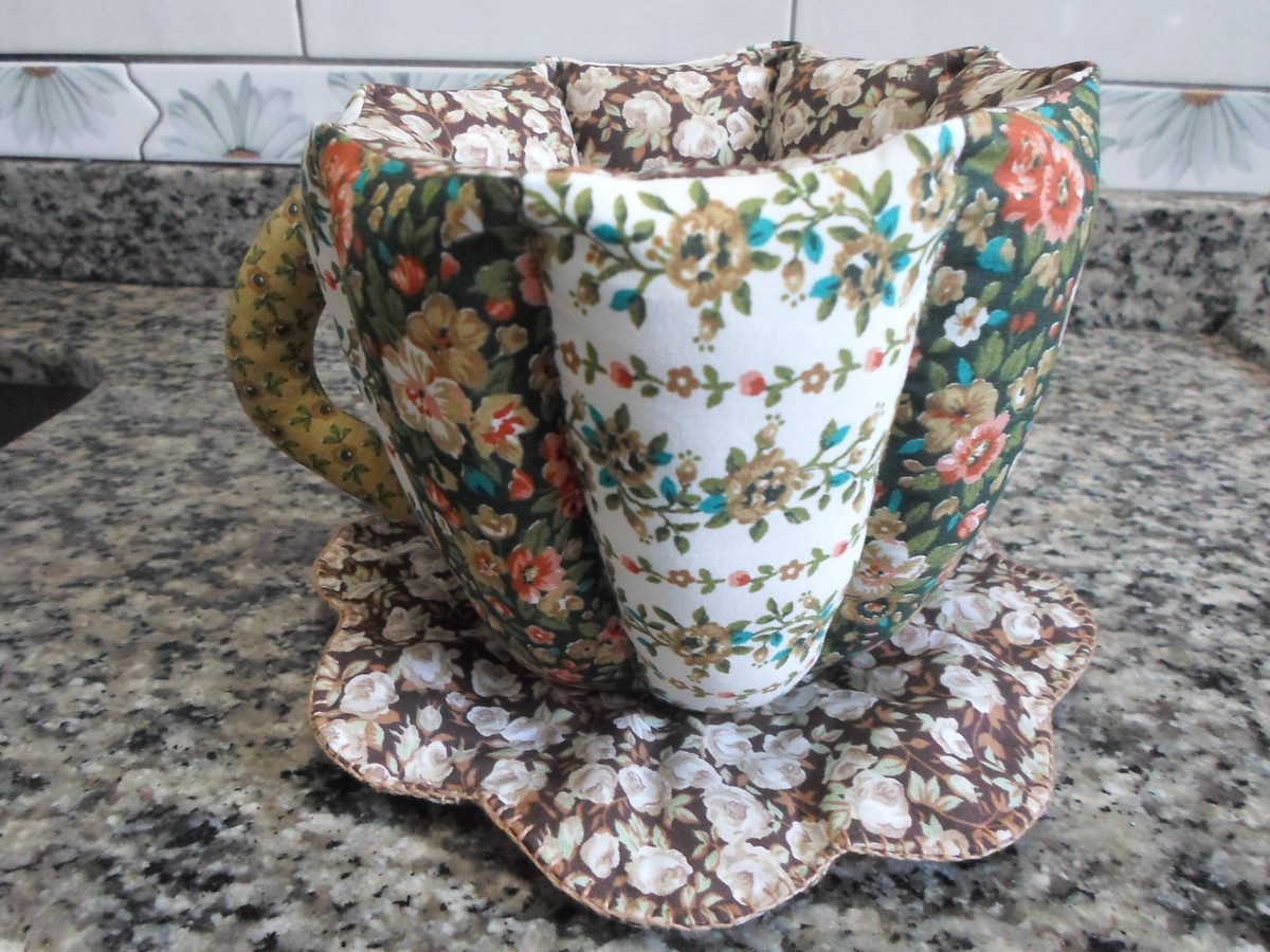 A xícara em patchwork é uma peça decorativa e utilitária. Serve como porta sachês de chá, açúcar, adoçantes, bombom, enfim, o que sua imaginação mandar.